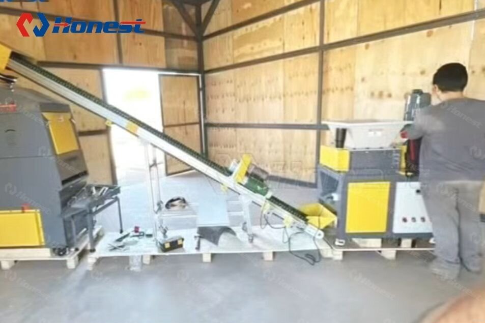 Our rubber tyre recycling machines have been successfully installed and are now operating at a customer factory in India. The complete line includes a block cutter, strip cutter, cracker, and steel/rubber separator, and is capable of processing radial tyres. With a capacity of 2 tons per hour, the system efficiently recycles waste tires into reusable rubber and separated steel.