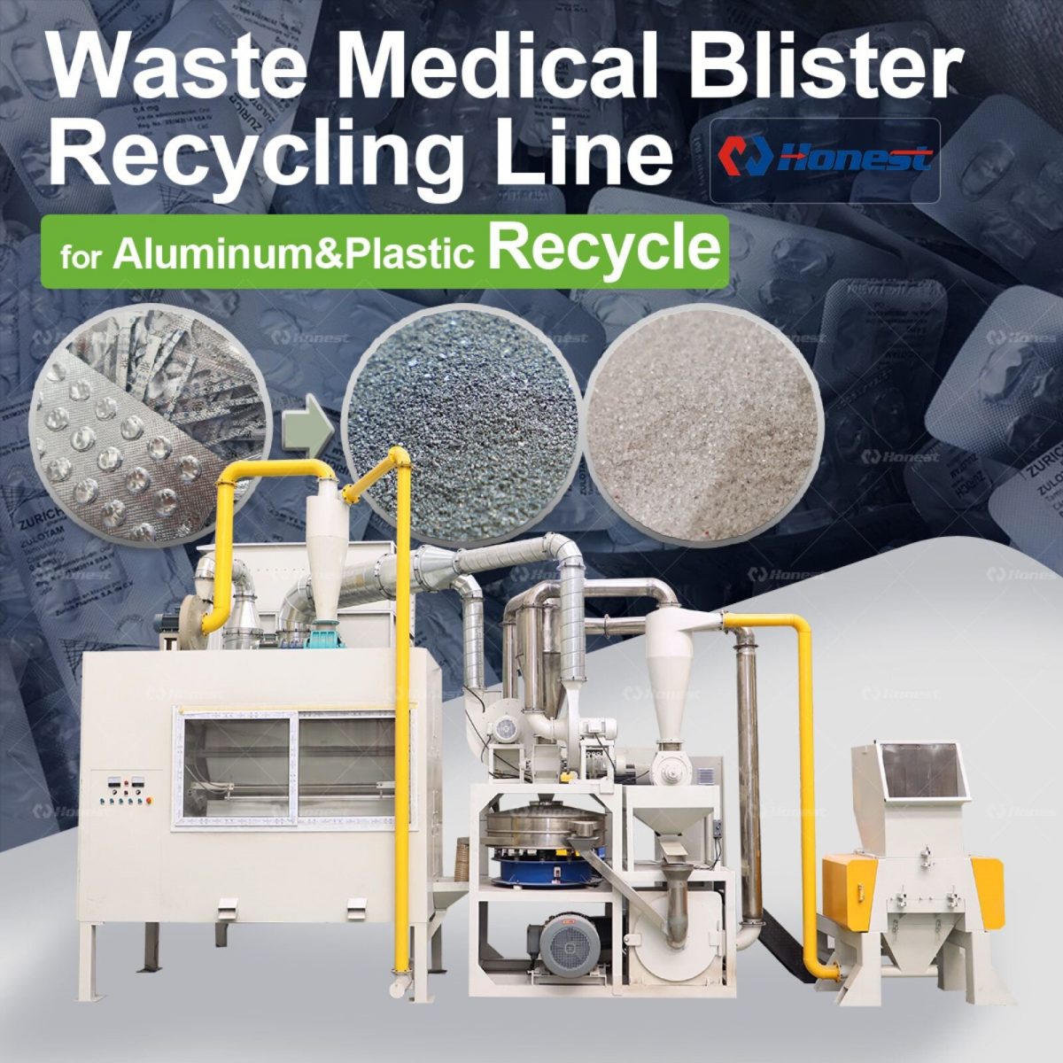 Our Medical Blister Packs Recycling Machine is specially developed for processing pharmaceutical packaging waste such as Alu-PVC and Alu-Alu blister packs. These materials typically consist of plastic (PVC or PET) and a thin aluminum layer, both of which are valuable…